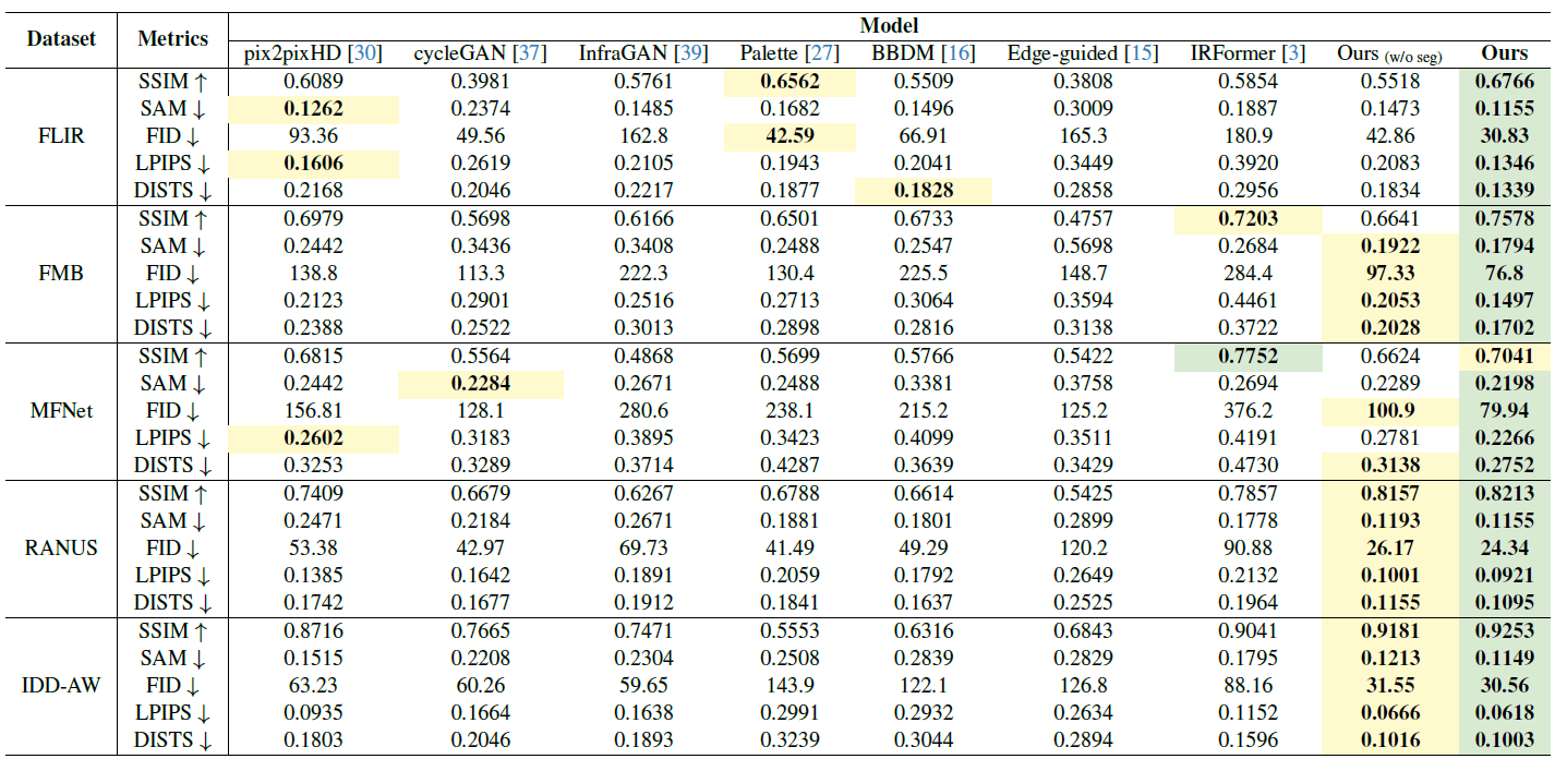 Quantitative comparison of the proposed model's performance across various infrared (IR) range datasets. The results demonstrate performance variations across different IR ranges and highlight where our model outperforms other methods based on SAM, FID, LPIPS, and DISTS metrics. The best results are shaded in green and the second-best results are shaded in yellow.